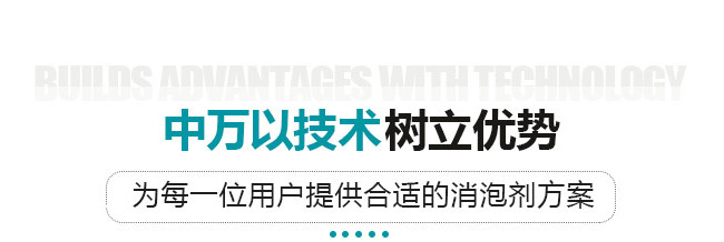 中萬是一家以解決各行業(yè)泡沫難題為使命的企業(yè),專注于各行業(yè)不同工藝的泡沫應用研究,擁有8大體系成分產品,近2000個不同行業(yè)、不同細分領域工藝的成功應用經驗與解決方案,為您的生產工藝保駕護航。中萬在化工泡沫領域扮演著重要的角色,從嚴謹?shù)倪x料到獨特的應用方案,推動著整個消泡劑行業(yè)的優(yōu)化升級,中萬因領先而備受推崇,用技術成就高效,提方案帶來卓越,讓服務適應市場,中萬在消泡劑精益求精的道路上不斷地為客戶謀發(fā)展而開拓創(chuàng)造。
